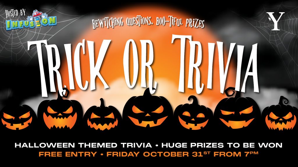 Join us at the YARRABILBA HOTEL on FRIDAY, OCTOBER 31ST at 7PM for a night of bewitching questions and boo-tiful prizes. Hosted by the infamous Infusion Trivia, this event is sure to be a scream!